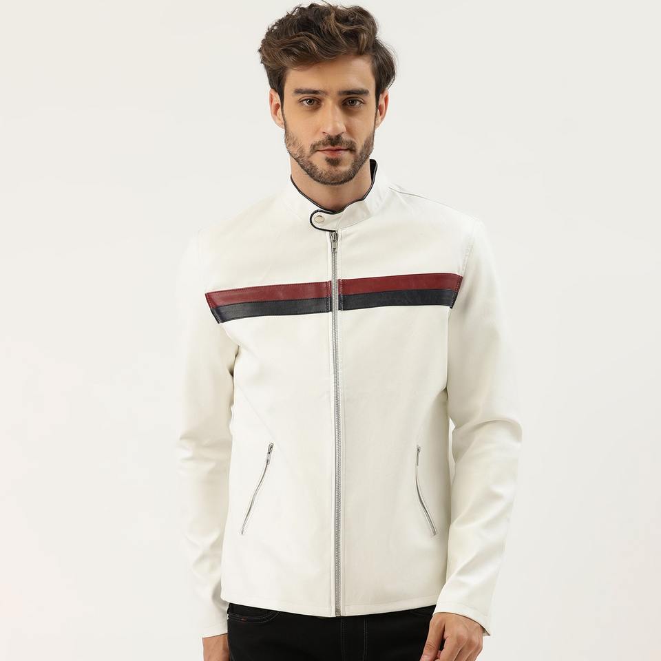 Chaqueta de cuero con cuello levantado para hombre, chaqueta informal de cuero de manga larga, color blanco, a la moda