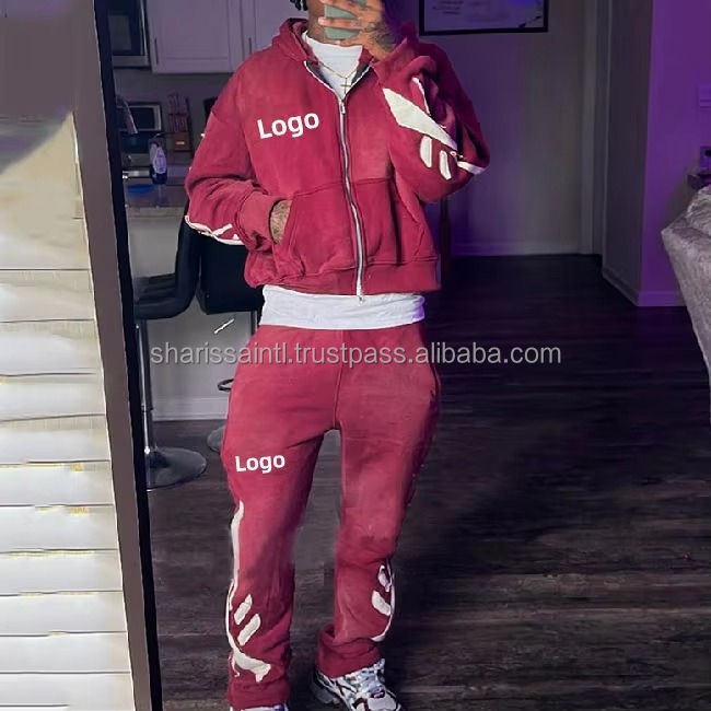 Chándales de algodón de alta calidad personalizados para hombre, conjunto de pantalones de chándal acampanados y Sudadera con capucha, ropa informal lavada con ácido, chándal para invierno