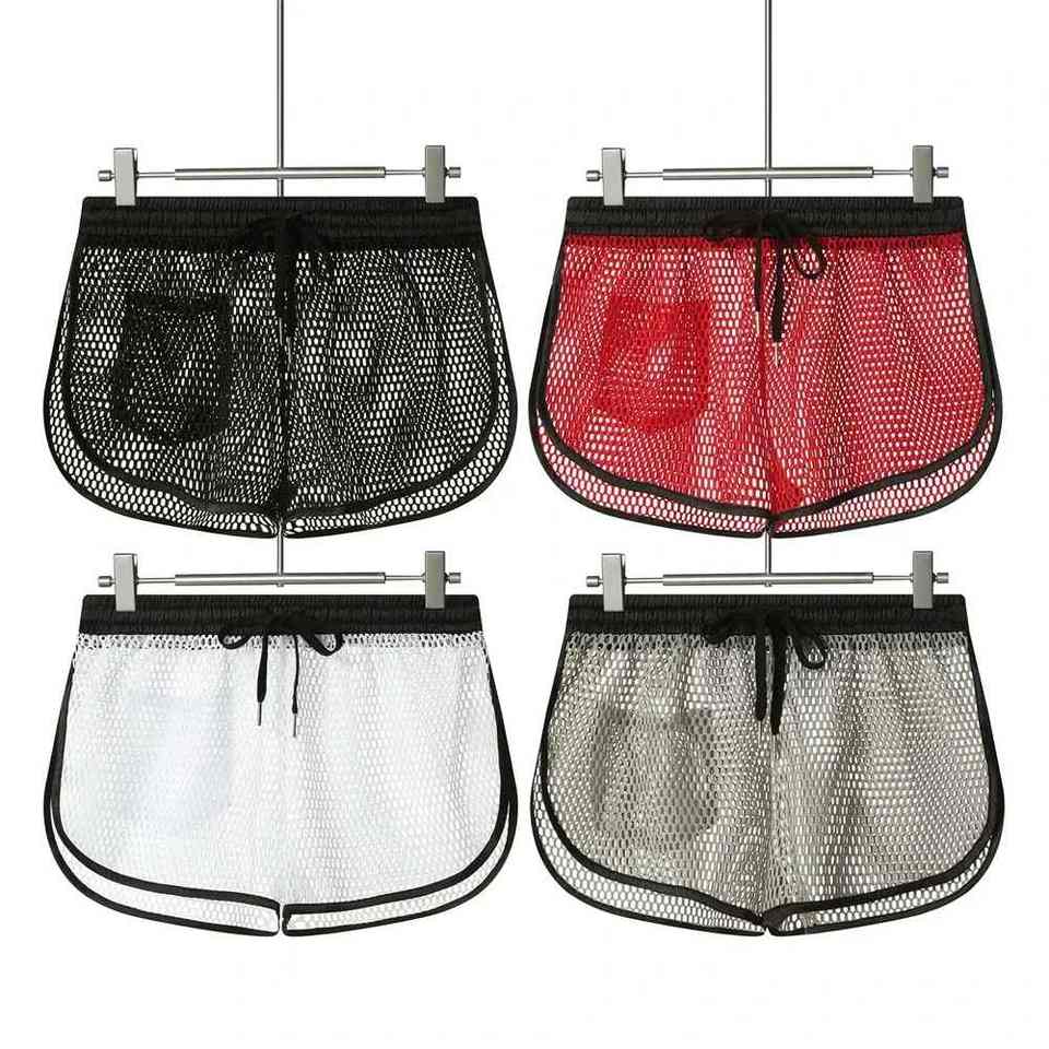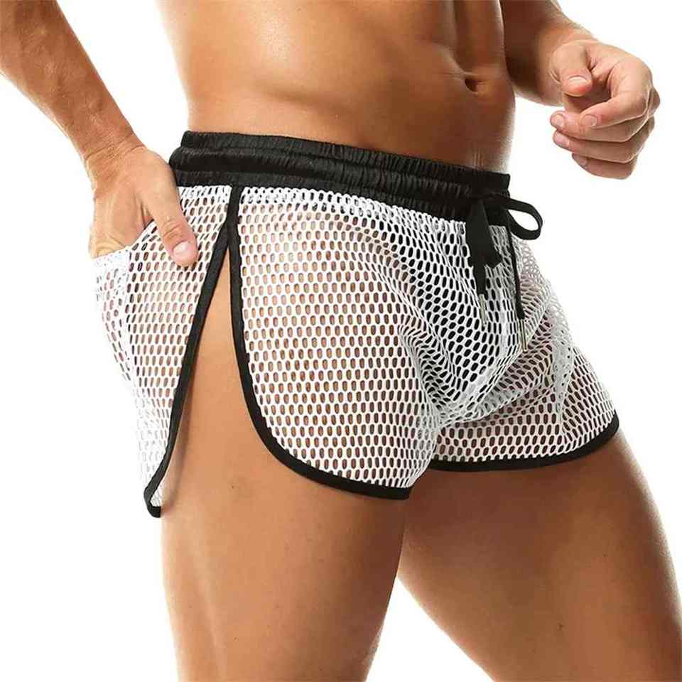 Bañador de playa holgado para hombre, pantalones cortos de malla de rejilla para hombre, ropa de descanso transpirable transparente, pantalones cortos sexis con abertura lateral