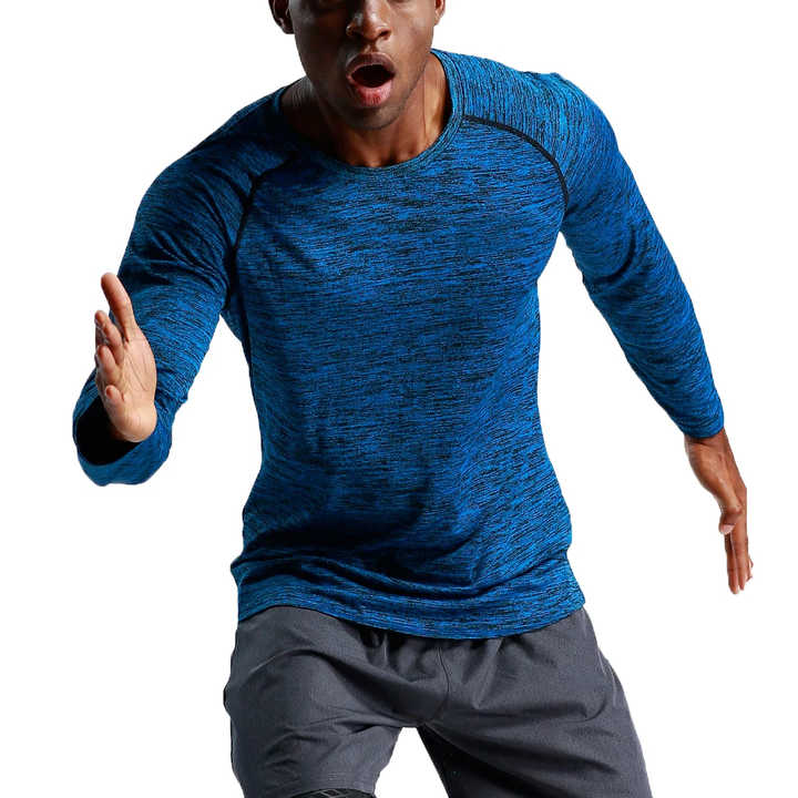 Nueva Camiseta deportiva ajustada para hombre, cuello redondo de color sólido con mangas largas plisadas raglán
