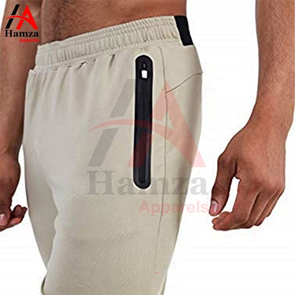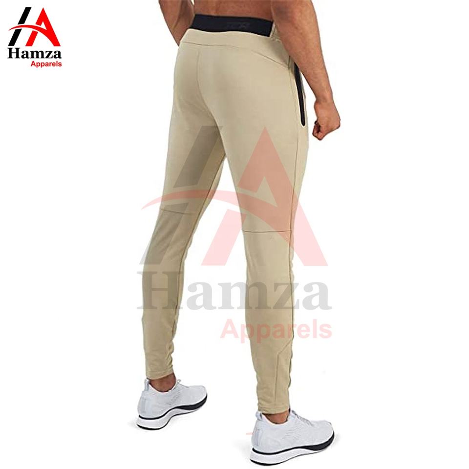 Pantalones de hombre elegantes Beige Slim Fit Joggers tela elástica ligera 250 GSM bolsillos laterales modernos con cremallera Casual Athleisure Wear