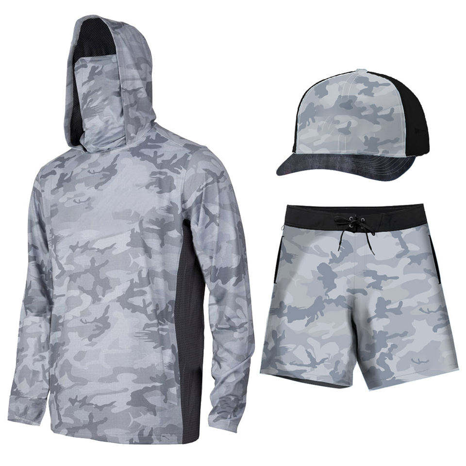 Conjunto de Ropa Interior Térmica de Camuflaje para Hombre, Transpirable, con Protección UV, Secado Rápido, Camisa de Pesca con Capucha, Pantalones Cortos y Gorra, 3 Piezas