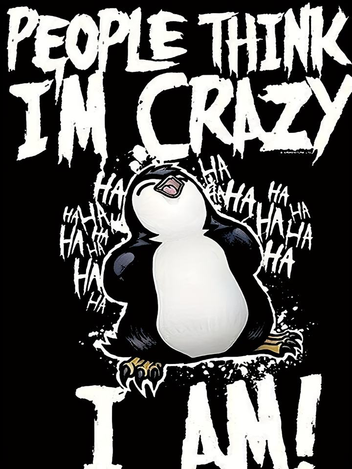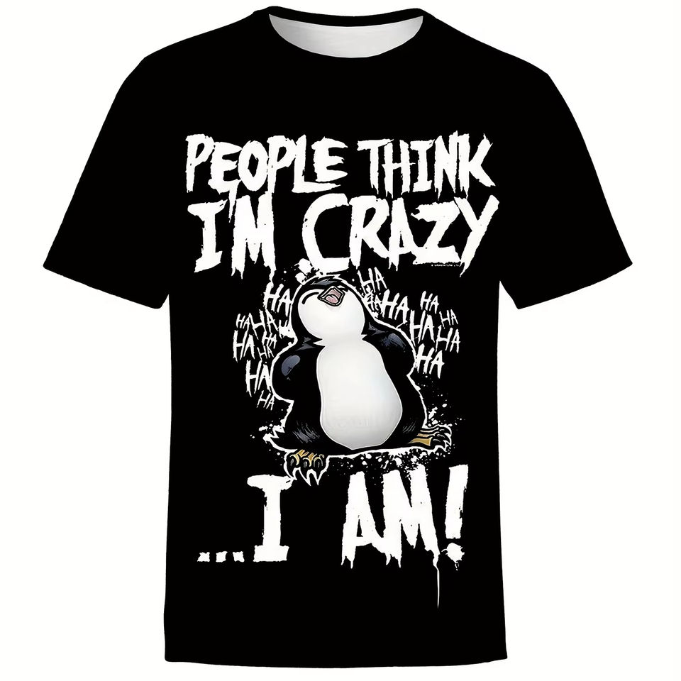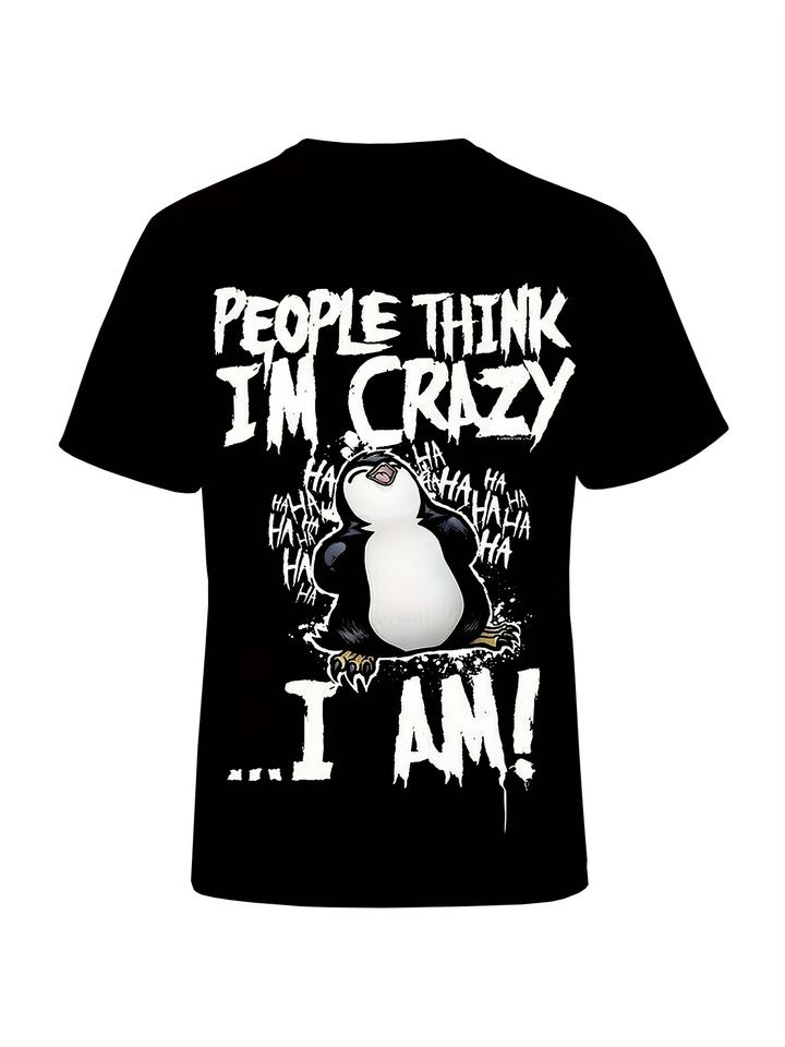 Camiseta de manga corta con estampado 3D de talla grande para hombre Bold 'People Think I'm Crazy 'Graphic Cartoon Penguin Design Loose Knitted