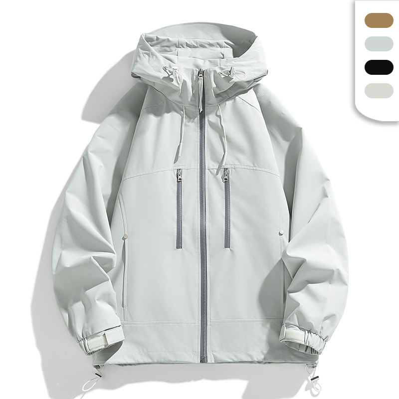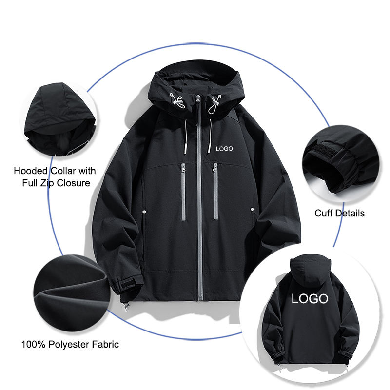 Práctica chaqueta de senderismo impermeable para hombre con logotipo personalizado negro sólido bolsillo con cremallera chaquetas con capucha para exteriores