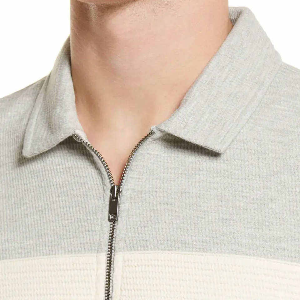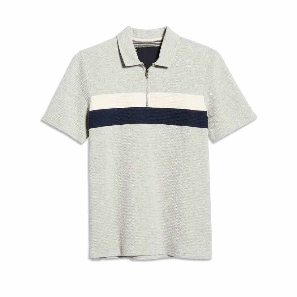 Polo de hombre con cremallera de un cuarto, bloques de color y franja en el pecho, 2026, estilo casual elegante, manga corta, corte ajustado, gris jaspeado y azul marino