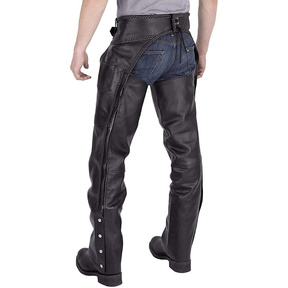 Chaps de cuero real para hombres Ropa de moto para hombres Chaps negros de cuero negro plano con bolsillos de Mezclilla-X-Large