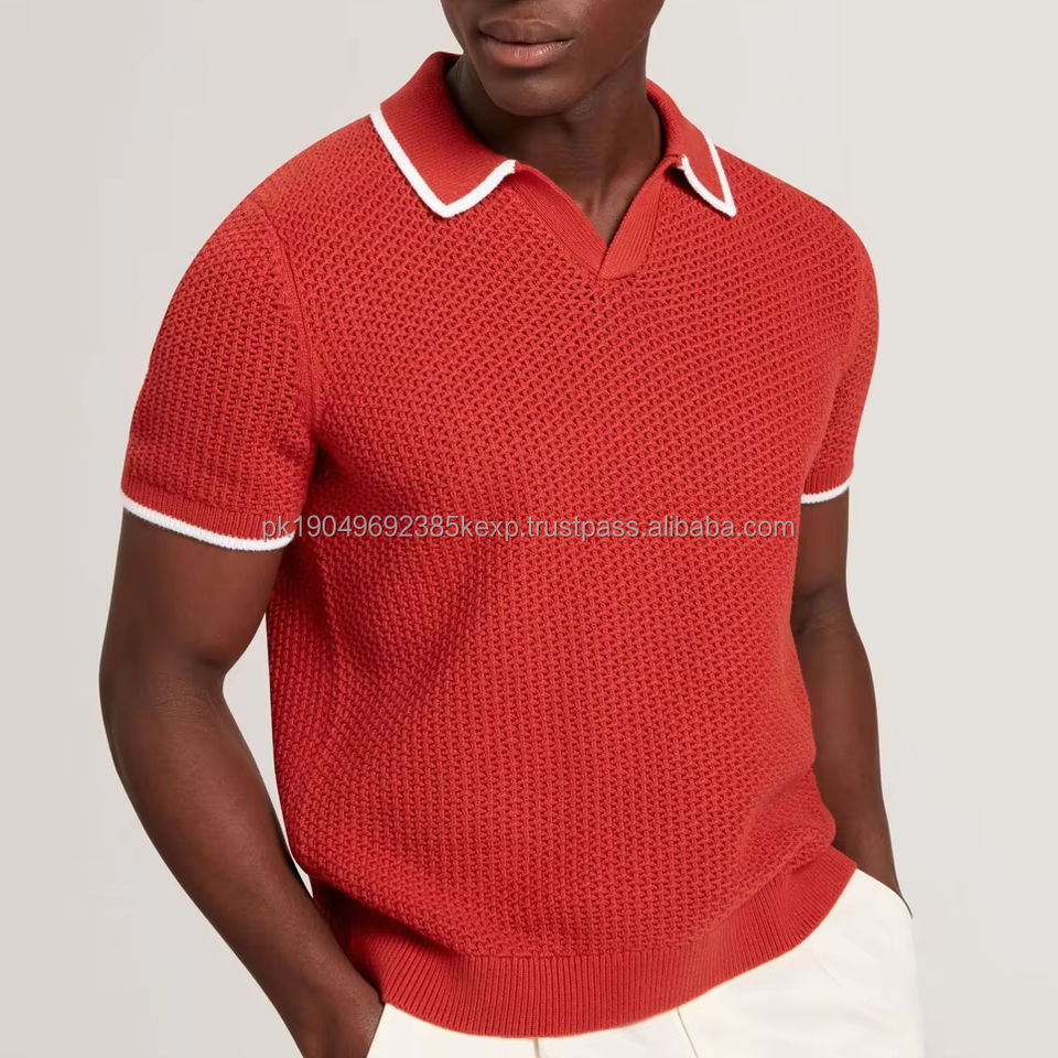 Polo de Punto con Punta Roja para Hombre, Algodón Pima, Manga Corta, Suéter Texturizado