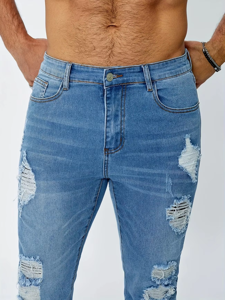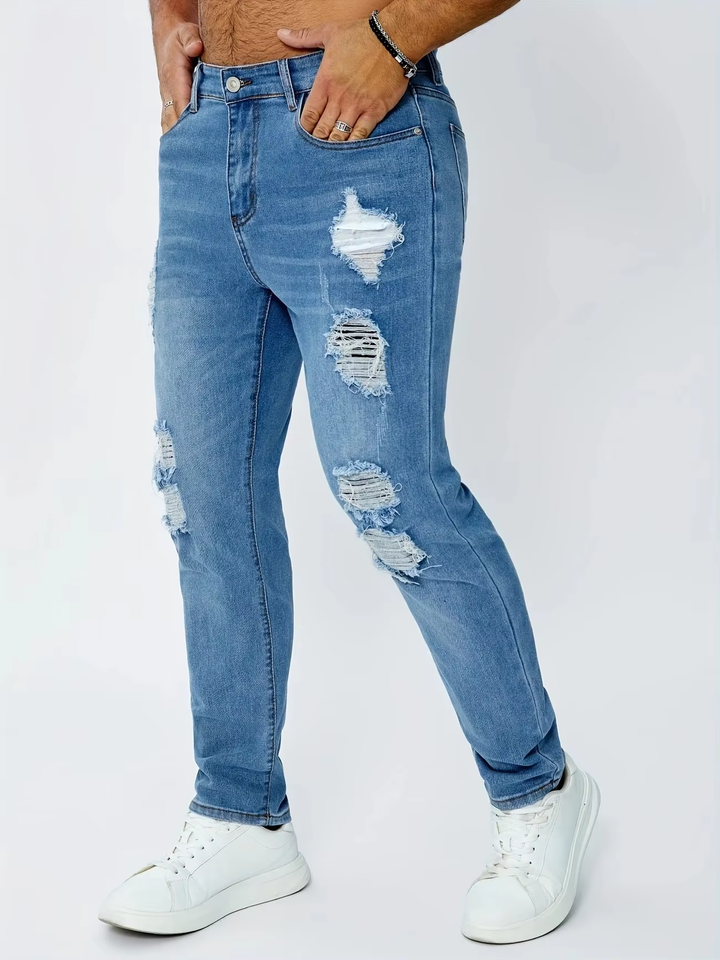 Jeans Rectos Rotos para Hombre, 60% Algodón, 28% Poliéster, 10% Viscosa, 2% Elastano, Denim Casual, Elasticidad Media, Secado Rápido, Invierno
