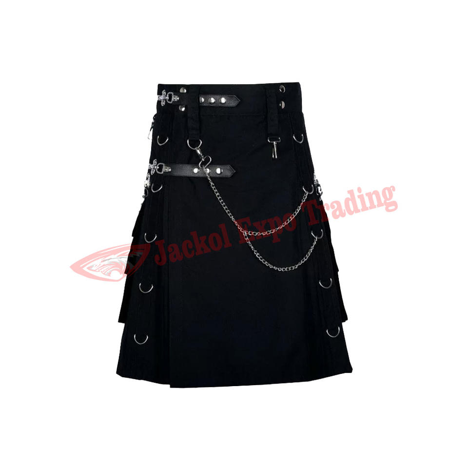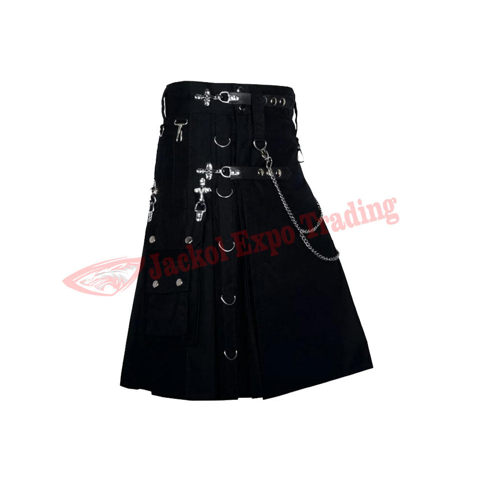 Kilt de moda gótico escocés para hombre Steam Utility algodón negro Bolsillo de carga hecho a mano tartán Kilts tamaño 30 a 56