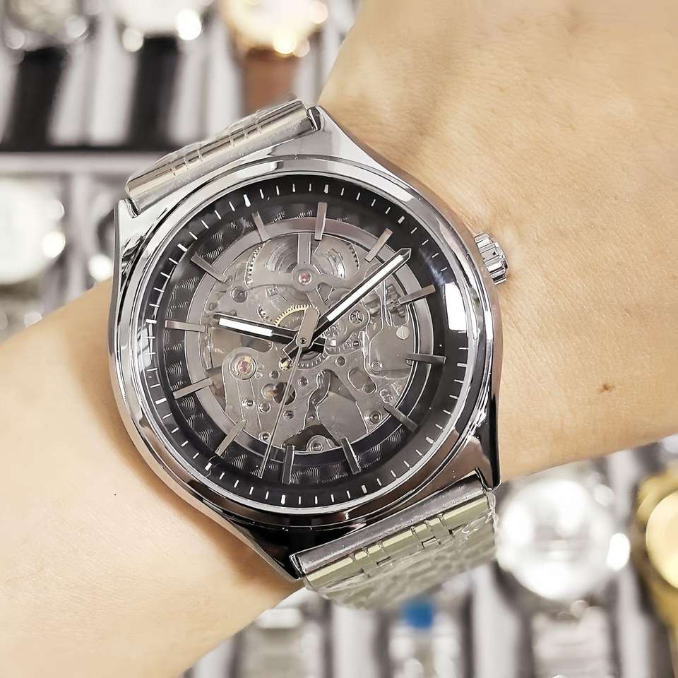 Reloj mecánico esqueleto para hombre, correa de acero inoxidable, reloj de pulsera con esfera transparente