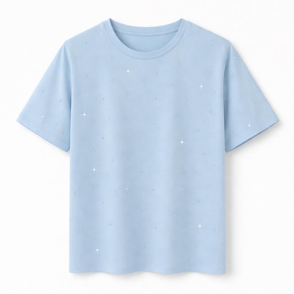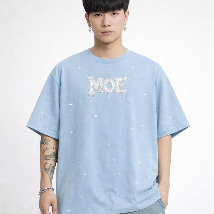 Camiseta de hombre de verano con estampado de letras de diamantes de imitación termoadhesivos, estilo 100% algodón, con diamantes de imitación brillantes en toda la prenda, OEM EE. UU.