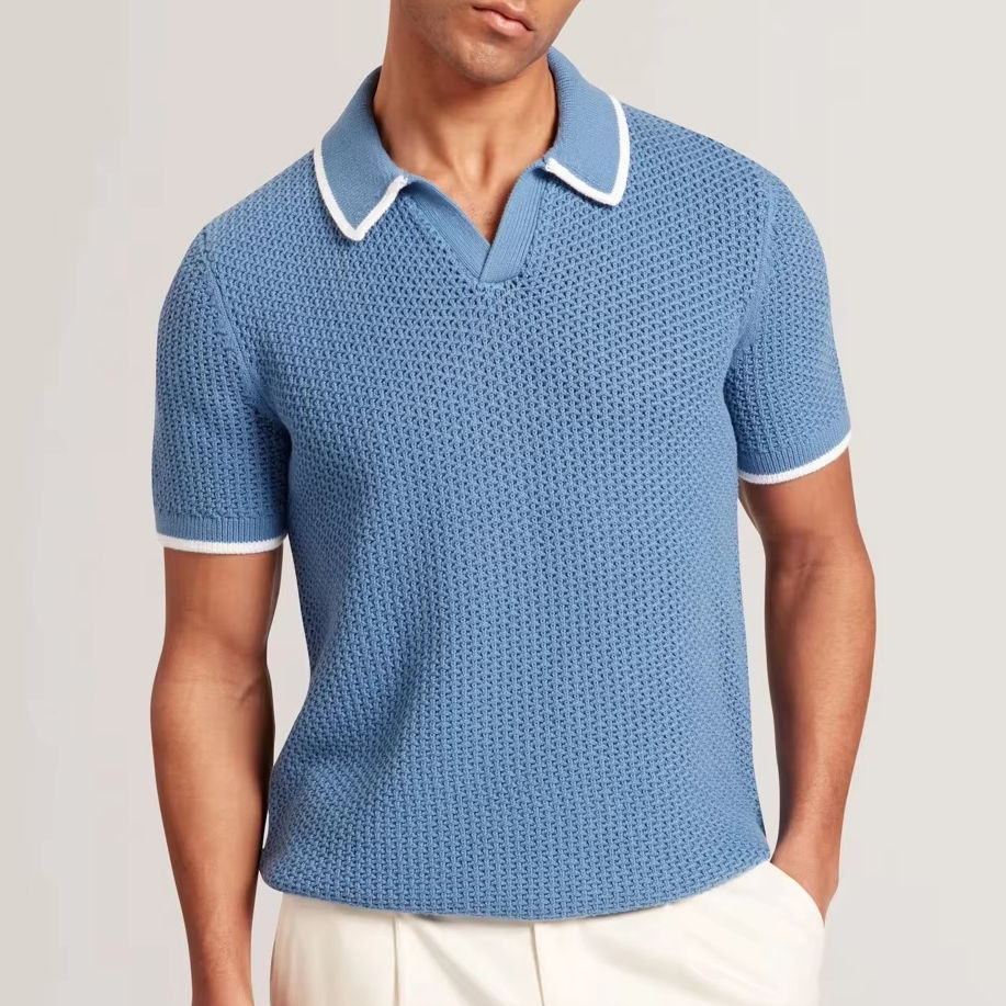 Polo de Punto con Ribete para Hombre, Camiseta de Manga Corta de Algodón con Textura y Ribete en Contraste