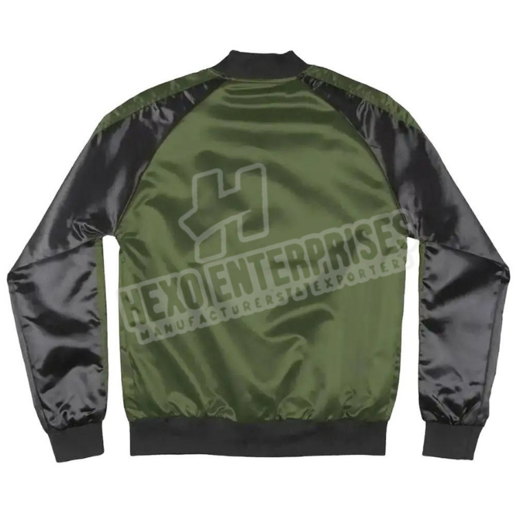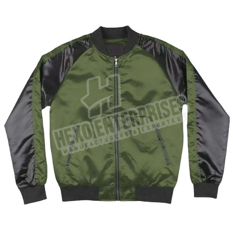 Chaqueta de satén con cuello de béisbol y logotipo personalizado al por mayor para hombre, chaqueta de satén con dobladillo acanalado y cremallera completa a prueba de viento para hombre