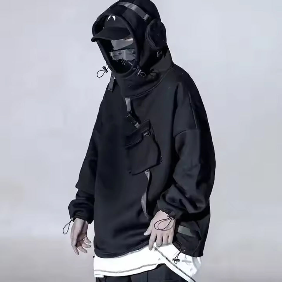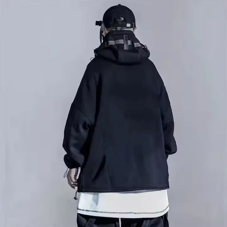 Sudadera con Capucha Cyberpunk Techwear para Hombre, Talla Grande, Negra, de Algodón y Felpa, Lisa, con Bolsillo, Secado Rápido y Transpirable