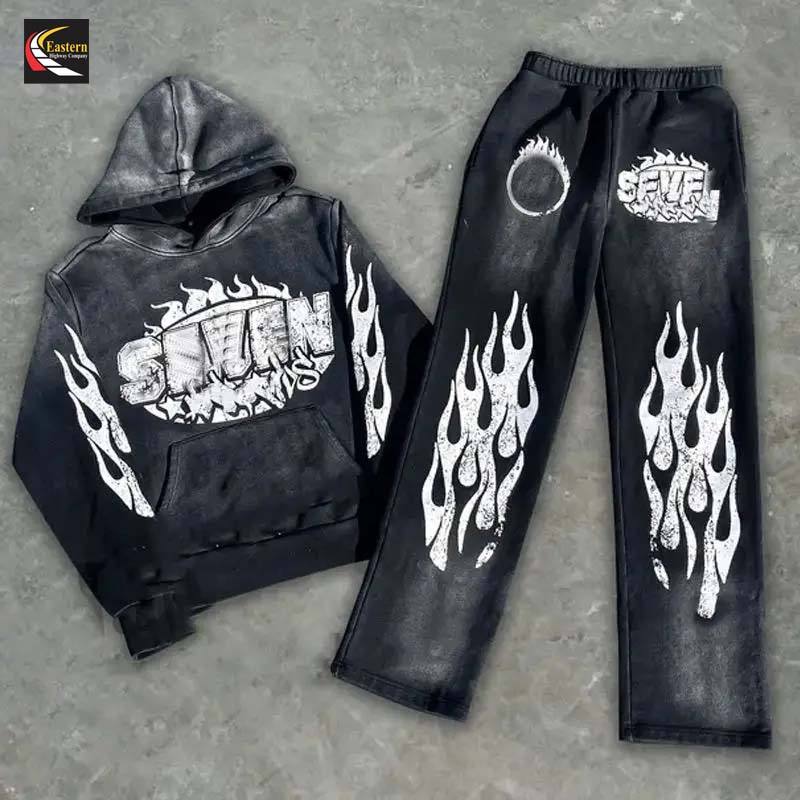 Conjuntos de dos piezas de invierno para hombre, pantalones de chándal acampanados con serigrafía de lavado ácido y chándales con cremallera y cuello con capucha, detalle de diamantes de imitación