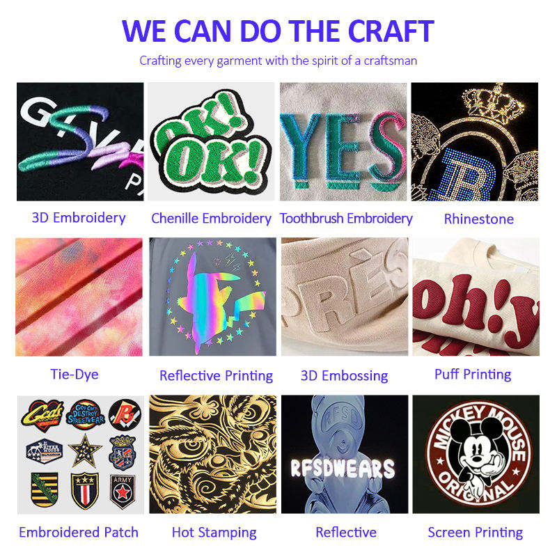 Bordado, Impreso, Lavado, Estampado de hojaldre, Flocado, Bordado 3D, Bordado con rebordos, De diamantes de imitación, Bordado de toalla, Aplique, Bordado lisoTécnicas