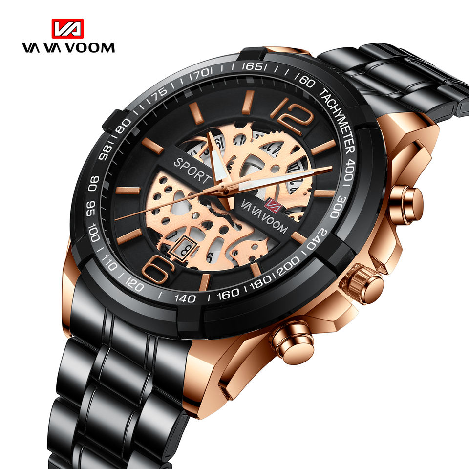 Reloj automático de negocios para hombre, caja de oro rosa, correa de acero negro, esfera esqueleto, reloj de pulsera para caballeros