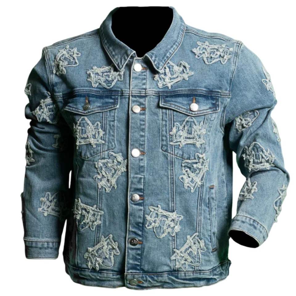 Chaqueta Vaquera Desgastada para Hombre, Cierre de Botones, Lavado Vintage, Patrón Bordado, Estilo Casual Urbano