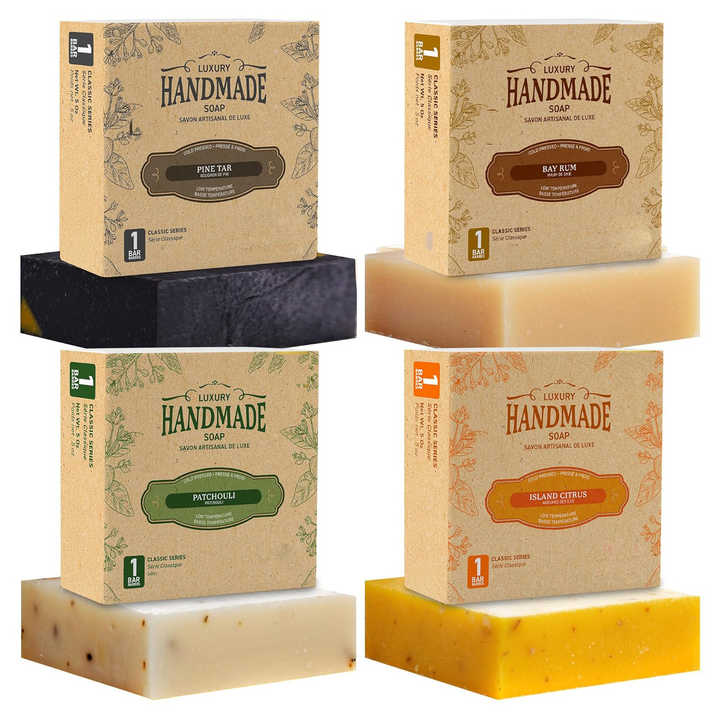 Jabón en Barra Artesanal para Hombre, Totalmente Natural, Procesado en Frío, 4 Aromas Masculinos Intensos: Ron de Bahía, Alquitrán de Pino, Jabón Negro, Pachulí Isleño