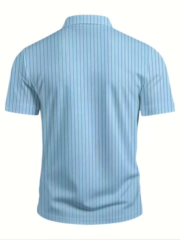 Camisa Polo a Rayas Azul Claro para Hombre, Manga Corta, Cierre de Botones, Tejido Texturizado, Corte Ajustado Informal, Prenda Superior para Exteriores