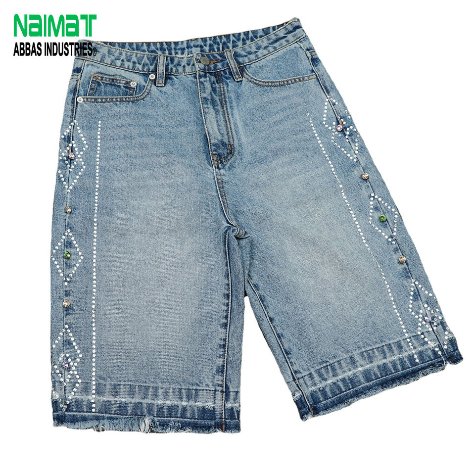 Pantalones cortos de mezclilla para hombre, lavado claro, con pedrería, corte ajustado, hasta la rodilla, con cuentas de cristal y dobladillo deshilachado