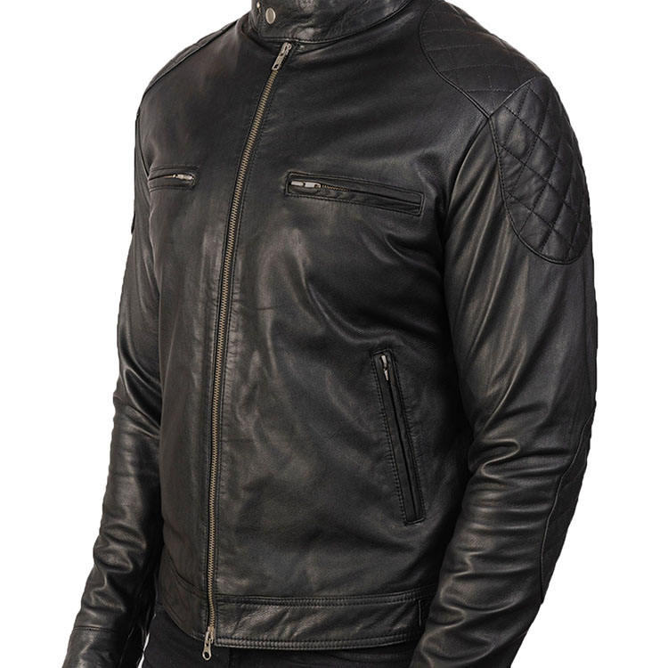 Chaqueta de Motociclista para Hombre, de Cuero y Lona, Corte Slim, con Cuello Redondo y Cremallera Diagonal, Calidad Premium MS-LJ-042