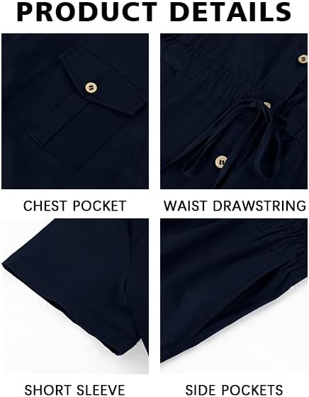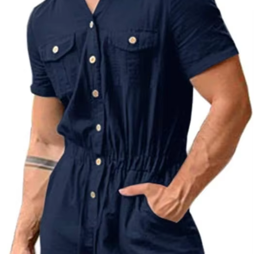 Mono de Talla Grande para Hombre, Estampado, de Algodón, con Botones, Manga Corta, de una Pieza, con Cordón Ajustable y Bolsillos