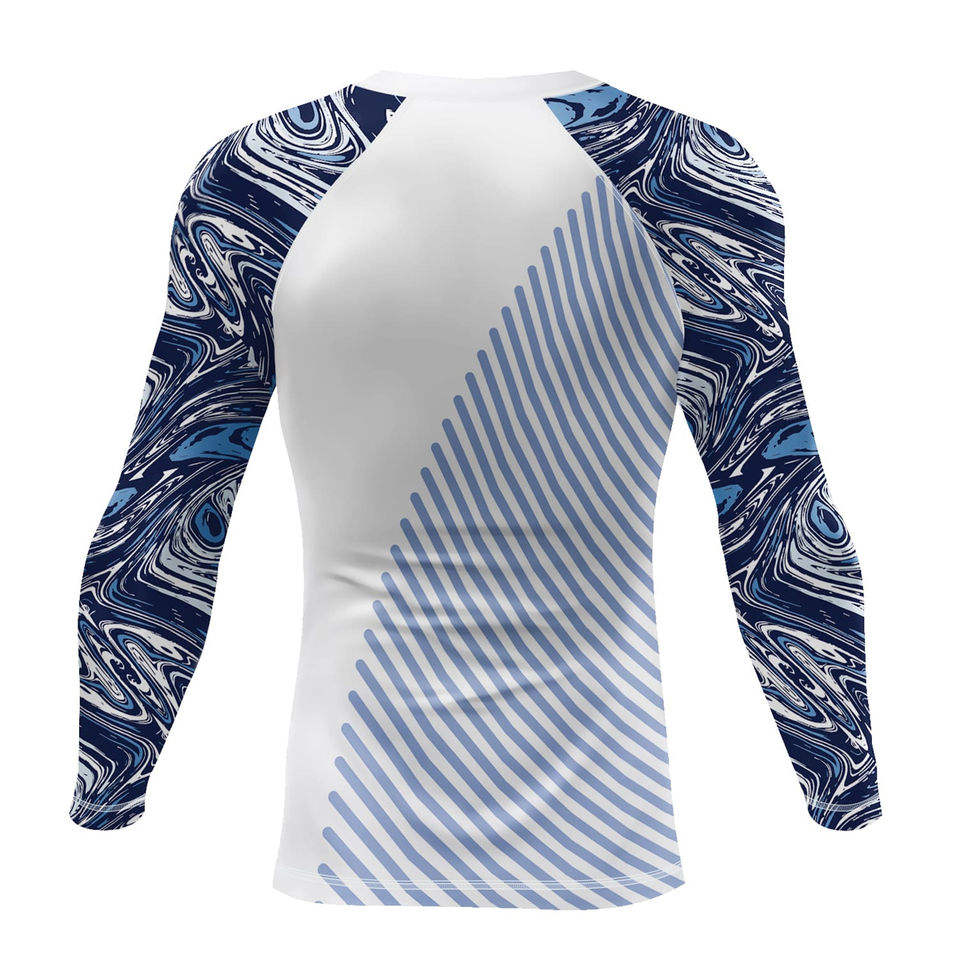 Camiseta de Compresión Deportiva para Hombre, Manga Larga, Negra con Patrón Abstracto Azul en las Mangas, para Gimnasio y Entrenamiento