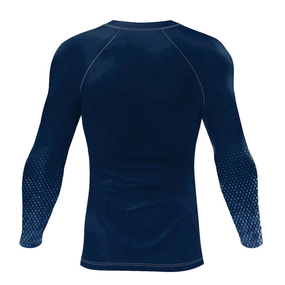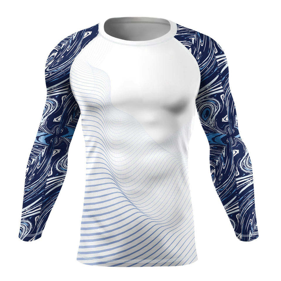 Camiseta de Compresión Deportiva para Hombre, Manga Larga, Blanca con Diseño Abstracto de Remolinos Azul Marino en las Mangas, para Entrenamiento, Gimnasio y Deportes