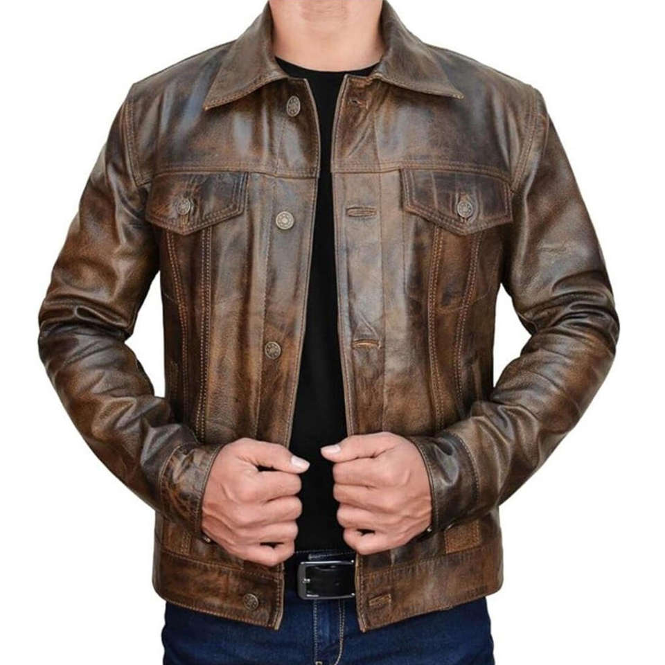 Chaqueta Trucker Retro de Cuero Vacuno para Hombre