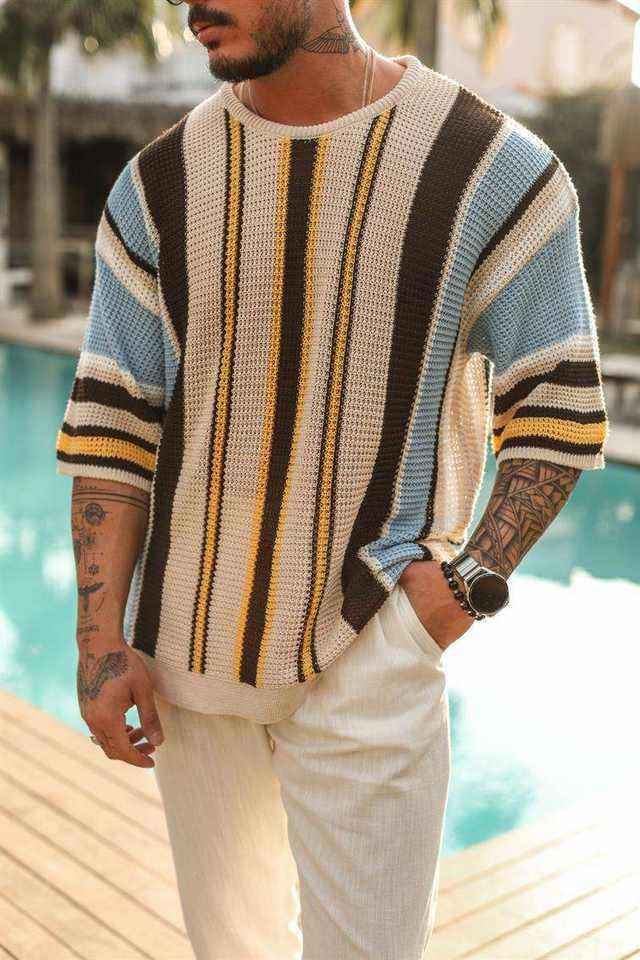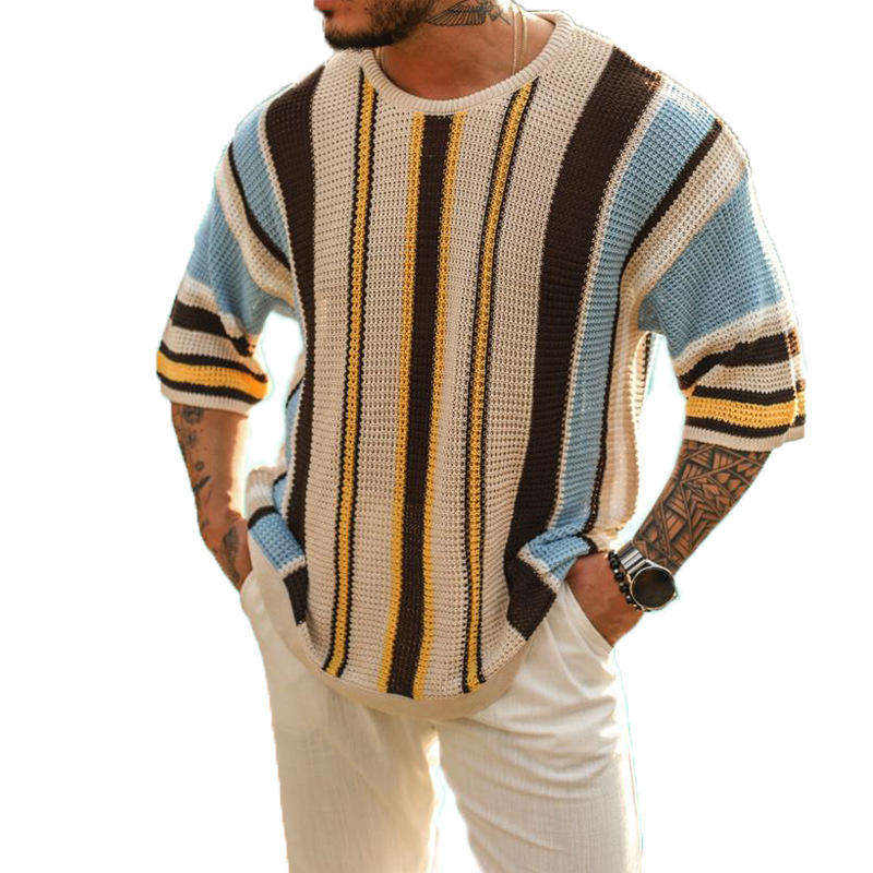 Suéter de punto a rayas para hombre Jersey de verano ligero de media manga Moda informal Suave transpirable Cómodo OEM ODM Proveedor