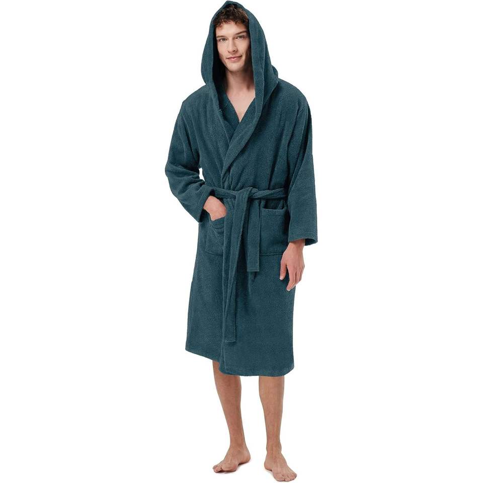 Albornoz de felpa para hombre con capucha, de algodón, largo hasta la rodilla, para spa o ducha, con bolsillos, suave, de manga larga