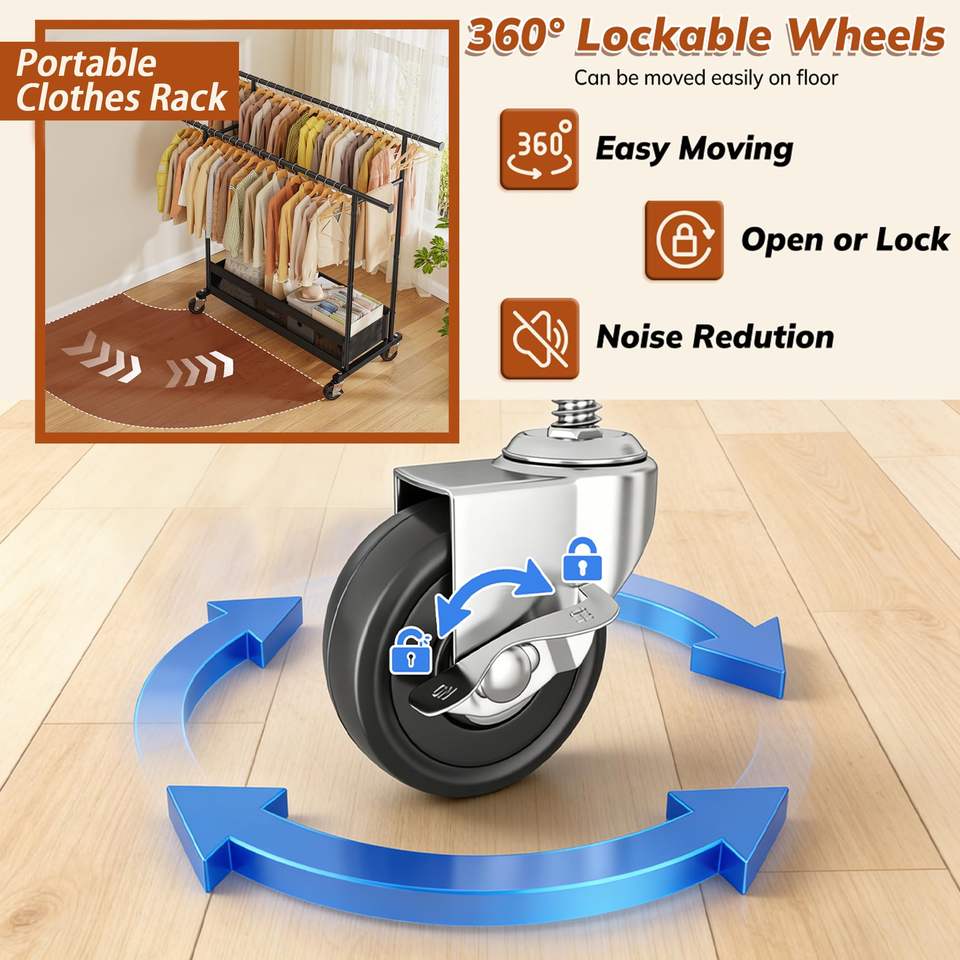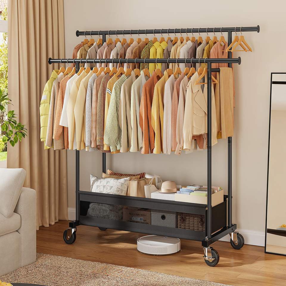 Perchero metálico con ruedas, perchero doble con barra, organizador de almacenamiento de ropa independiente, perchero resistente para prendas.