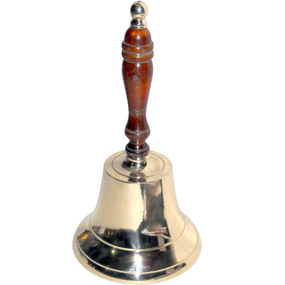 Campana de mano de artesanía de metal con mango de madera, servicio de restaurante al por mayor, artículo decorativo para el hogar de alta calidad, nuevo diseño, producto superior