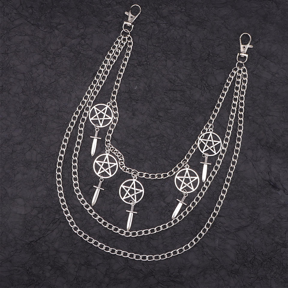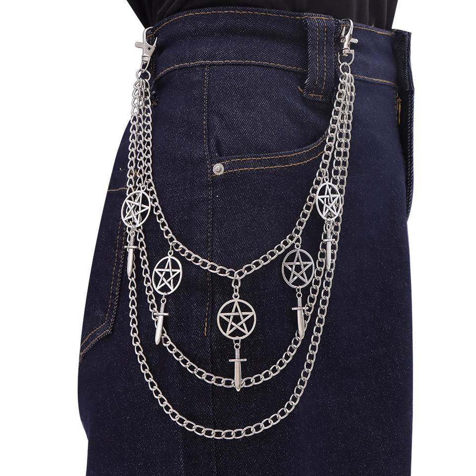 Cadena de cintura de aleación de zinc con diseño de espada de estrella de cinco puntas de metal, cadena de pantalón multicapa para uso diario, cadena corporal unisex de moda.