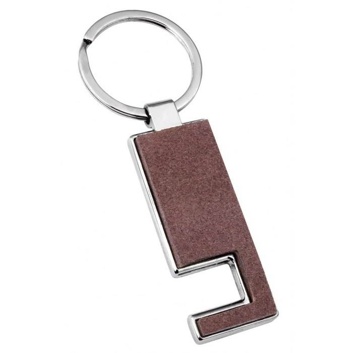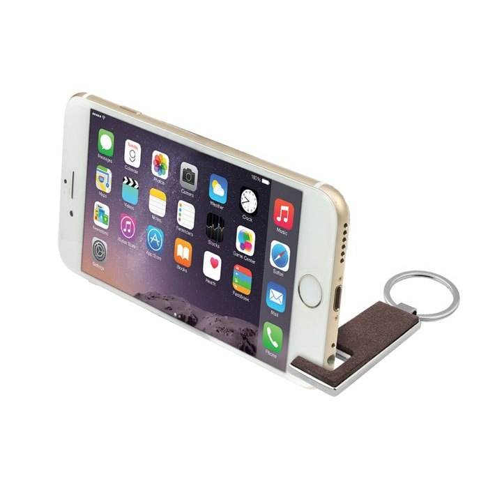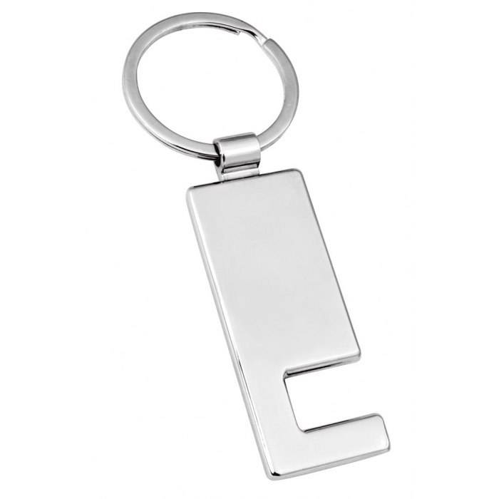 Llavero Metálico con Soporte para Teléfono, Diseño Rectangular, Acabado Plateado, Accesorio para Llaves