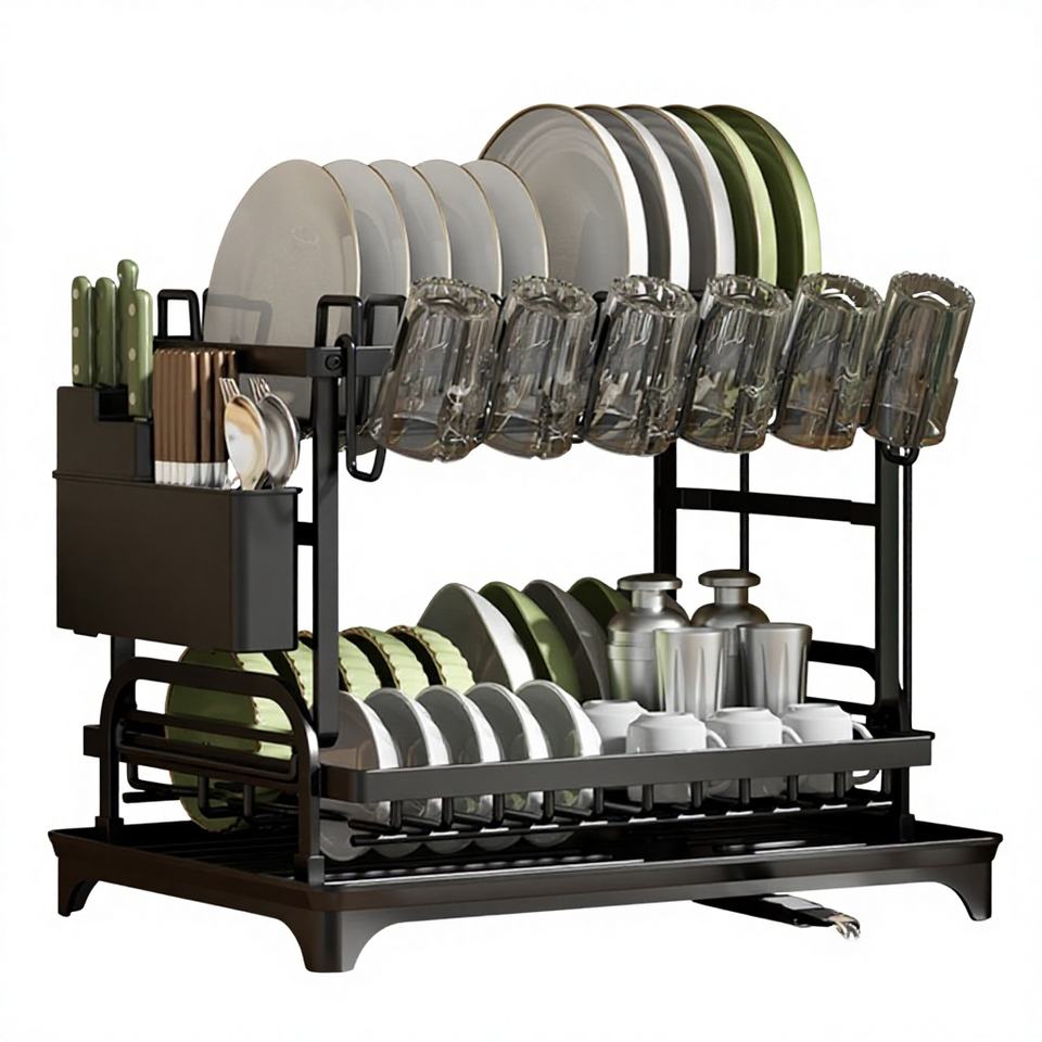Escurridor de cocina metálico multifuncional con soporte para platos, tazas y cubiertos, y escurremante automático para palillos y utensilios de corte.