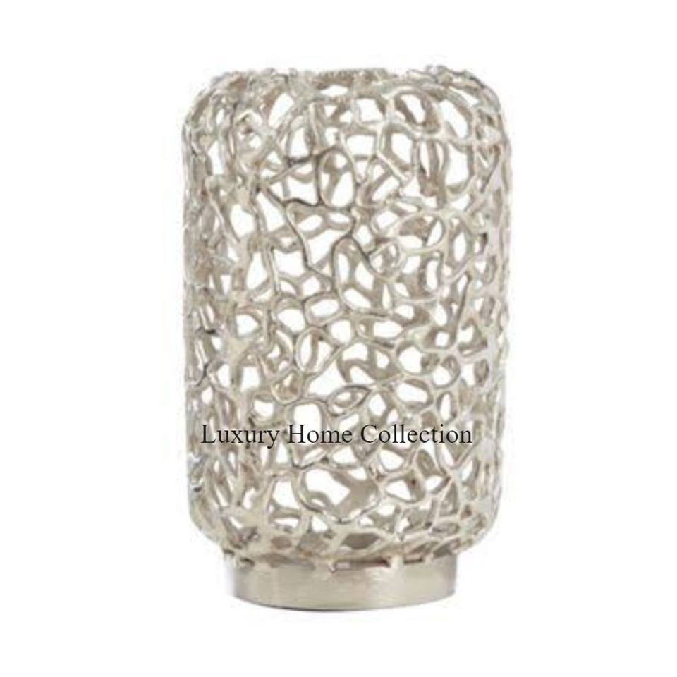 Nuevo jarrón de metal Diseño completamente perforado Fundido Hecho de aluminio Color plata Bien pulido con base resistente Soporte de flores y macetas