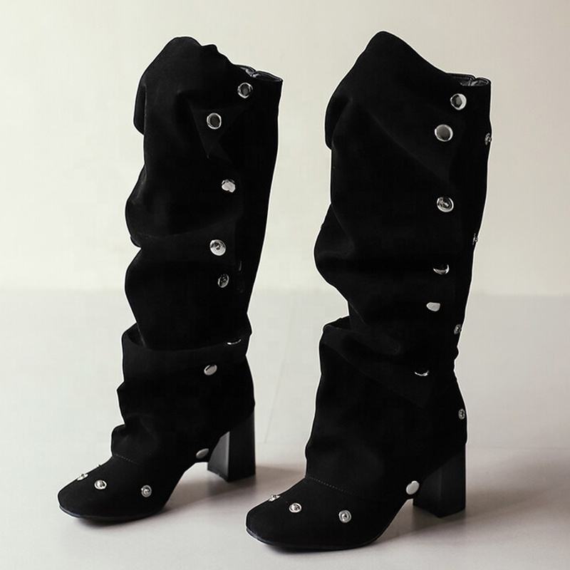 Botas largas de mezclilla para mujer con remaches metálicos, parte superior plisada, tacones gruesos, punta cuadrada, talla grande 48, ajuste ancho, botines altos hasta la rodilla