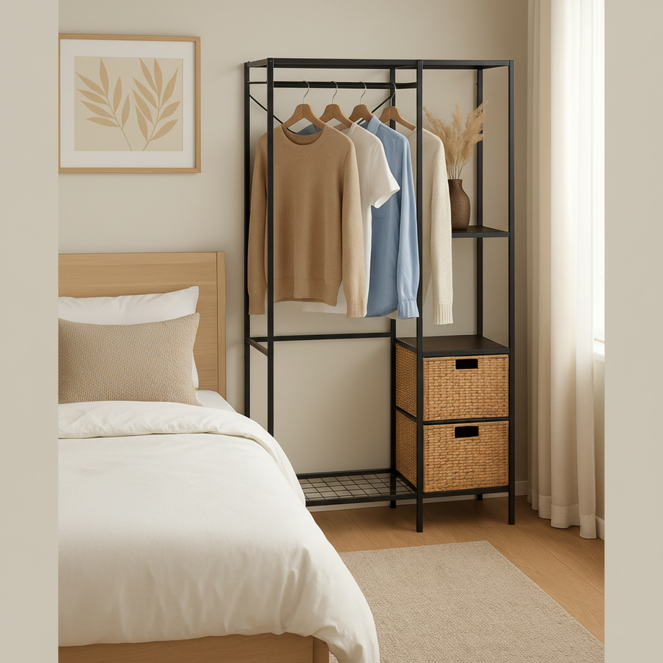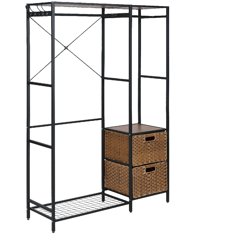 Perchero de metal para ropa con cesta de almacenamiento de ratán PE | Perfecto para tu dormitorio