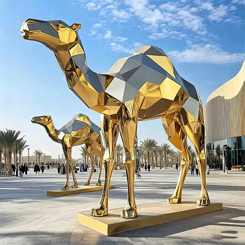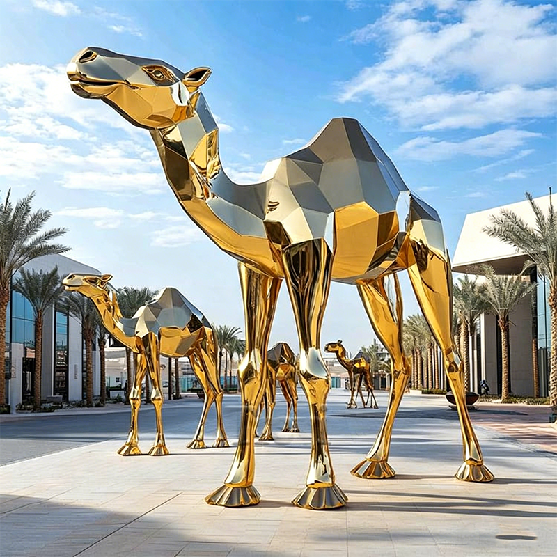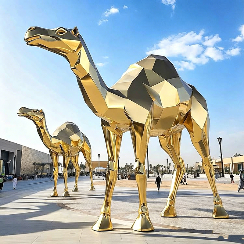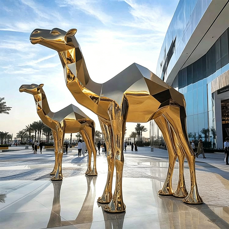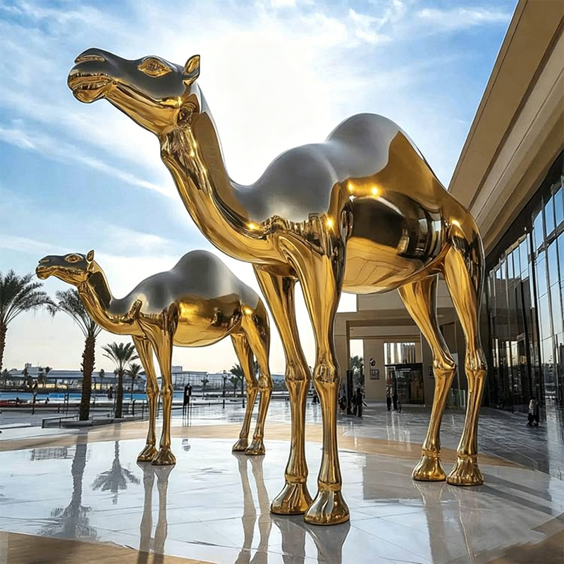 Escultura de Camello de Acero Inoxidable Dorado Grande, Estilo Medio Oriente, Mascota Icónica, Estatua de Camello con Acabado de Espejo Metálico