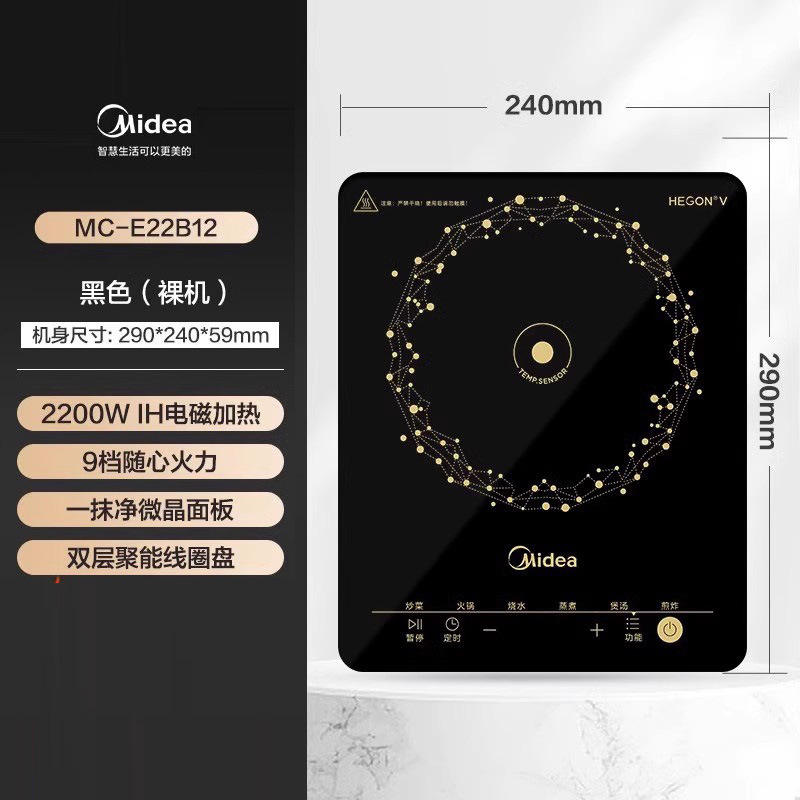 Cocina de Inducción Midea de un Solo Quemador, 2200W, Control Táctil, Panel de Cristal Negro, Estufa Eléctrica de Acero Inoxidable