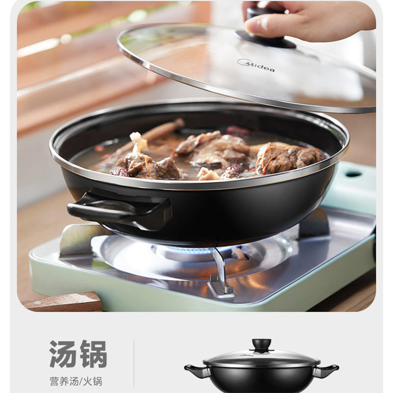 Juego de utensilios de cocina antiadherentes Midea de 3 piezas, sartén, olla para sopa con tapa, color negro, para estufas de gas e inducción