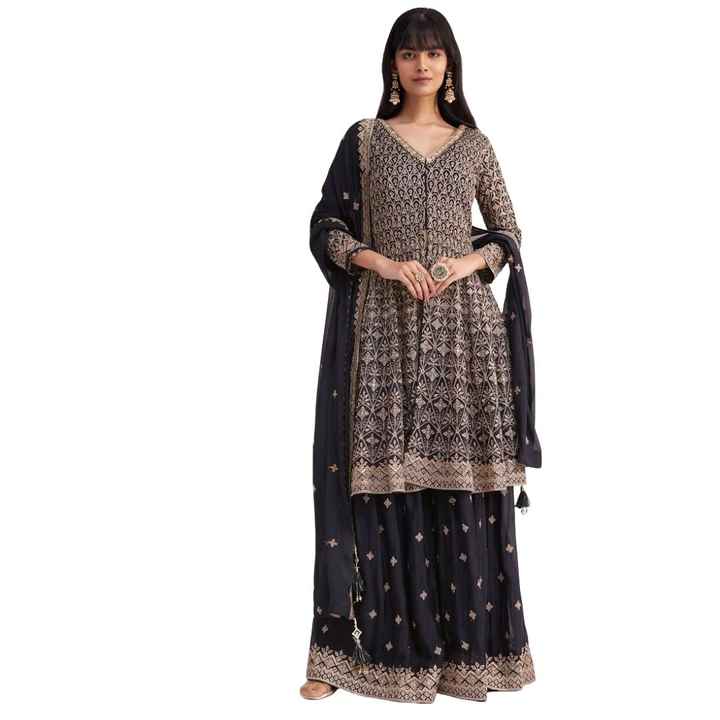 Traje Palazo bordado Georgette azul medianoche, venta al por mayor, Ropa Étnica para mujer, fábrica de ropa OEM, proveedor a granel, moda personalizada