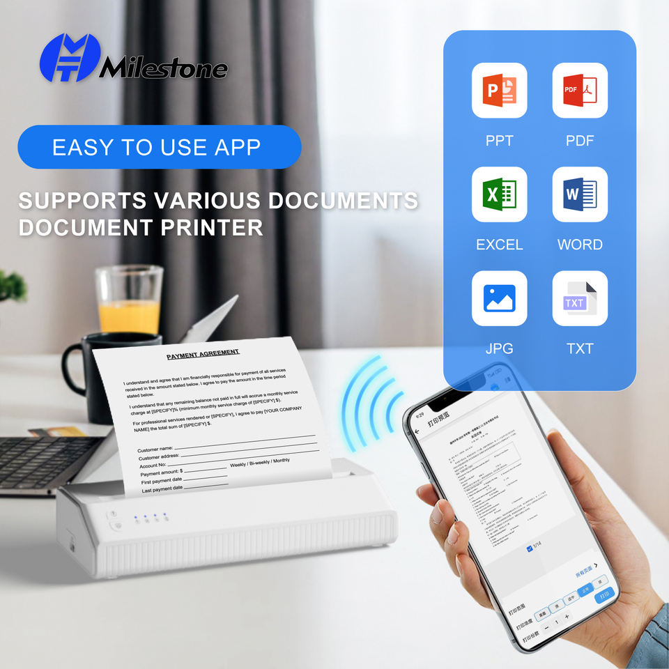 Impresora Térmica Portátil Mini A4 Milestone MHT-P8008WD de 8 Pulgadas, Sin Tinta, Interfaz USB, Compatible con IOS/Android/Windows, 203dpi