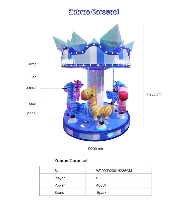 Mini máquina de columpio Merry Go round de 6 plazas, carrusel de cebras para niños que funciona con monedas, juego de parque de atracciones, energía eléctrica
