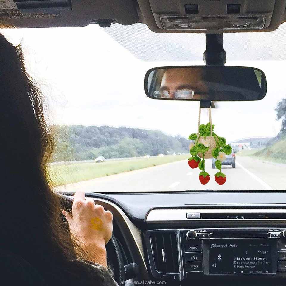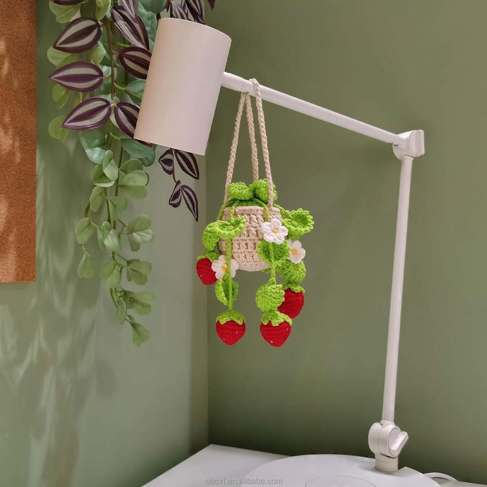 Mini colgante decorativo para coche con gancho, maceta de fresa tejida a crochet para colgar en el coche