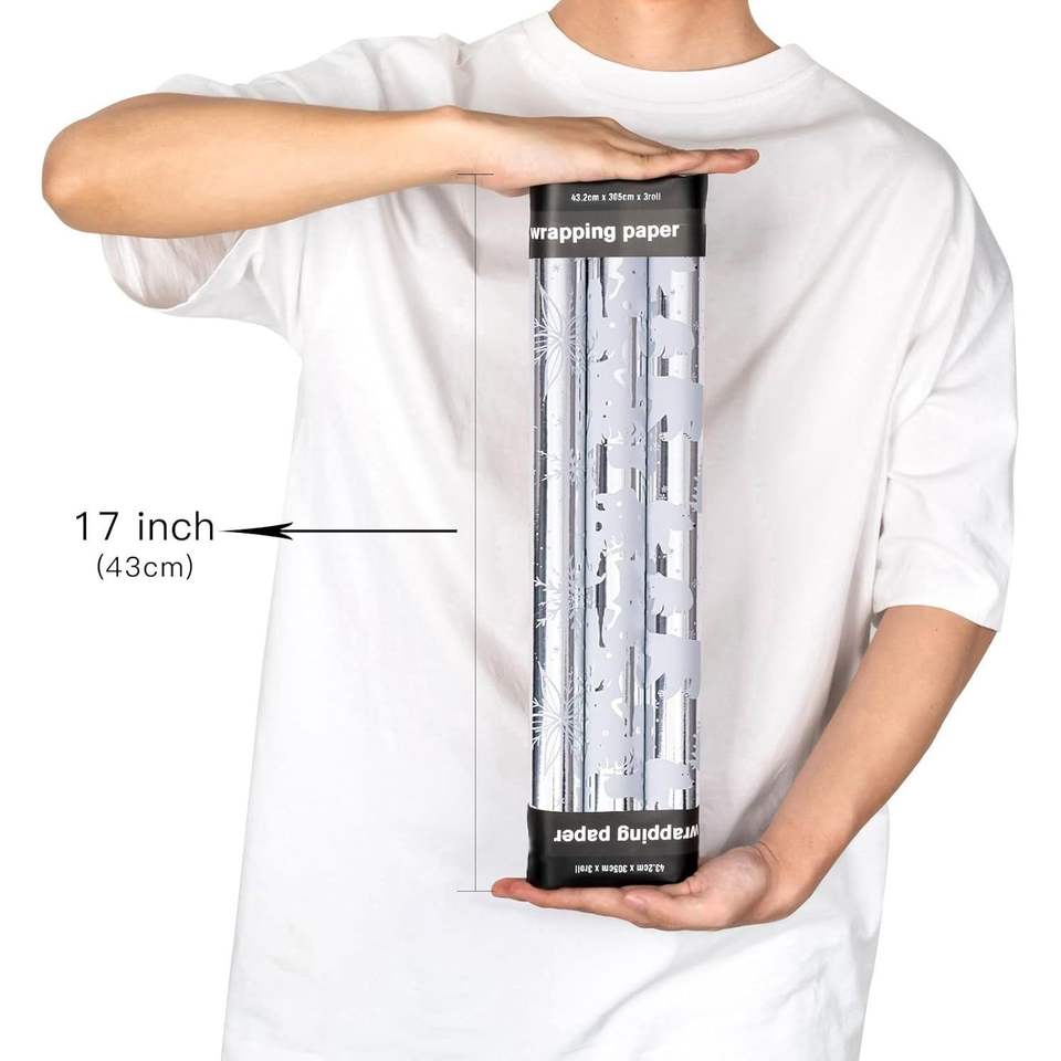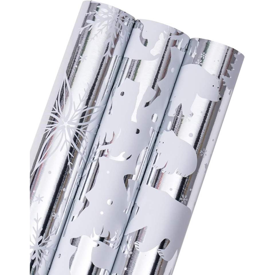 Mini Rollo de Papel de Regalo Navideño de 17 Pulgadas x 120 Pulgadas, Diseño de Oso Plateado y Copos de Nieve con Brillo Dorado, Artículos para Fiestas
