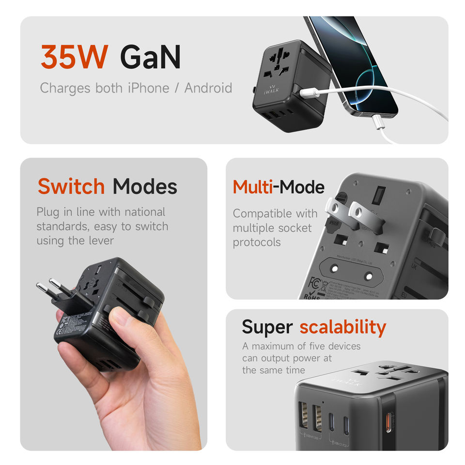 Mini Adaptador de Corriente Universal Multienclume, Cargador de Pared de Viaje Seguro con Carga Rápida PD GaN de 35W, Enchufe Integrado con Interruptor para EE. UU., UE, AU, RU, TH