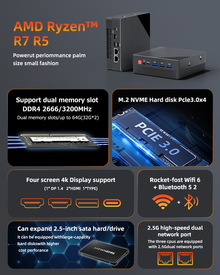 Mini PC con AMD Ryzen R7 7730U | Pantalla Triple | Tarjetas de Red Duales | Portátil para Oficina, Juegos y Uso Doméstico con WiFi6
